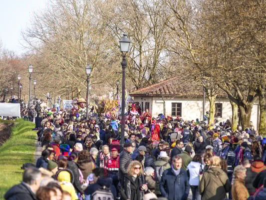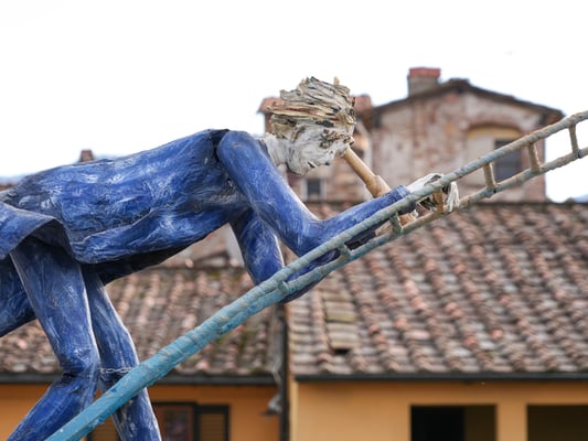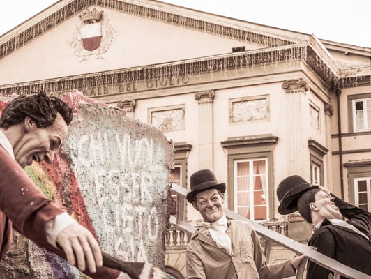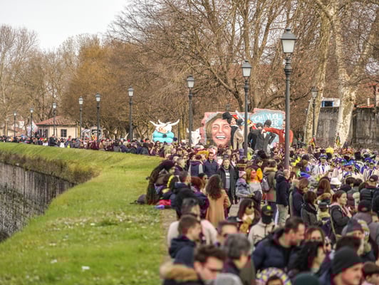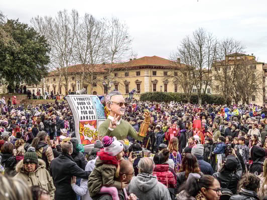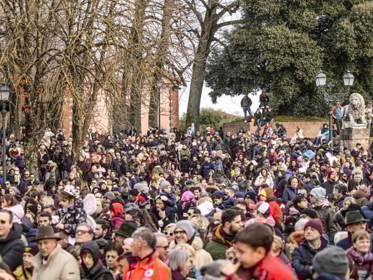 Una rappresentanza del famoso Carnevale di Viareggio, che celebra il suo 150° compleanno, si è infatti riversata sulle Mura urbane in mezzo a una folla festante di migliaia di persone.